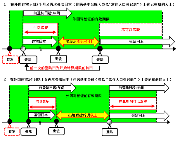 但住民基本台账(类似“常住人口登记表”)上登记在册的人士(日籍、中长期居留的外籍人士等)若在得以确认出境或得到再入境许可出境后不到3个月又再次登陆日本,那么其此次登陆日本的日期不能当作开始计算其可以驾驶的期限的首日(即所谓的“3个月规定”),因此不可以在日本驾驶。
