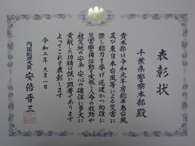 令和2年9月4日、総理大臣官邸において、令和元年房総半島台風等の発生に対し、県警 を挙げての各種災害対策の功績により、県警 として初めて防災功労者内閣総理大臣表彰を受賞しました。