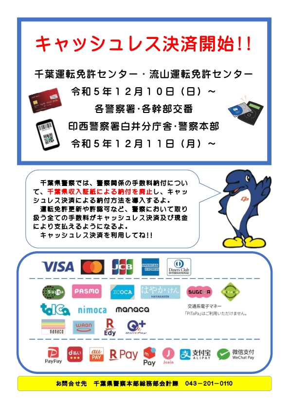 県民の利便性を向上させるため、警察において取り扱う手数料について、千葉県収入証紙による納付を廃止し、キャッシュレス決済又は現金で納付することができるようになりました。