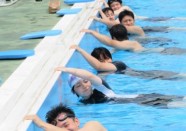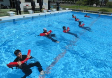 プールでは、着衣泳、水難救助の訓練などを行います。