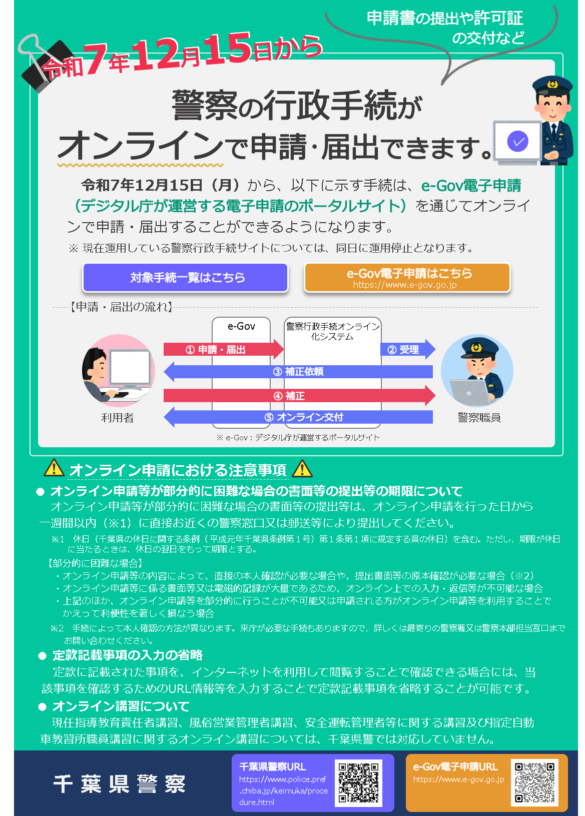 令和7年12月15日(月)から、以下に示す手続はe-Gov電子申請(デジタル庁が運営する電子申請のポータルサイト)を通じてオンラインで申請・届出することができます。