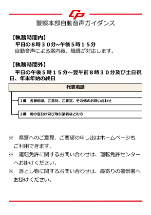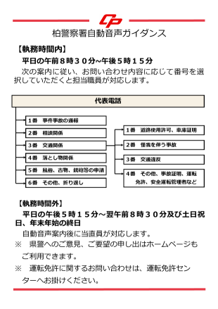 次のとおり、千葉県警察本部及び柏警察署の代表電話に自動音声ガイダンスを導入しています。
