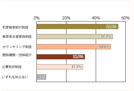 「犯罪被害給付制度」と答えた方が55.0%で最も多く、次いで被害者支援要員制度51.3%、カウンセリング制度50.0%、関係機関・団体紹介が32.5%、公費負担制度31.3%でした。