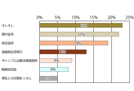 問2については、『オレオレ詐欺』が131件で23%、『還付金等詐欺』が124件で22%、『架空請求詐欺』が108件で19%、『金融商品等取引名目の詐欺』が74件で13%、『ギャンブル必勝法情報提供名目の詐欺』が51件で9%、『融資保証金詐欺』が45件で8%、『異性との交際あっせん名目の詐欺』が30件で5%となりました。