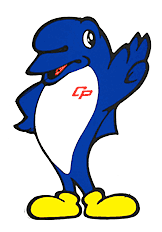 - イルカに手足。体は海の青色、足は菜の花の黄色。胸にCPのロゴ。