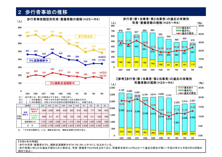 ・歩行中死者が48人で約4割(38.7%)を占めており、このうち高齢者は35人で約7割(72.9%)を占めている。