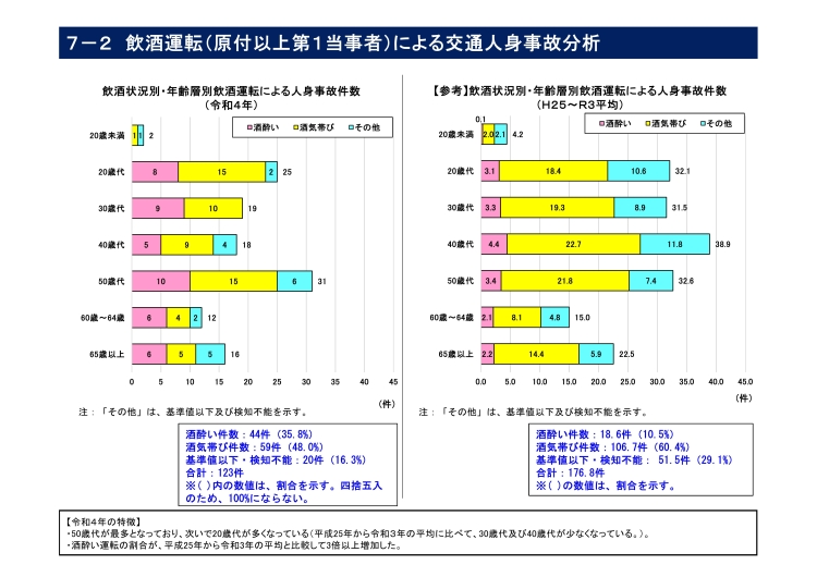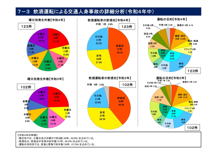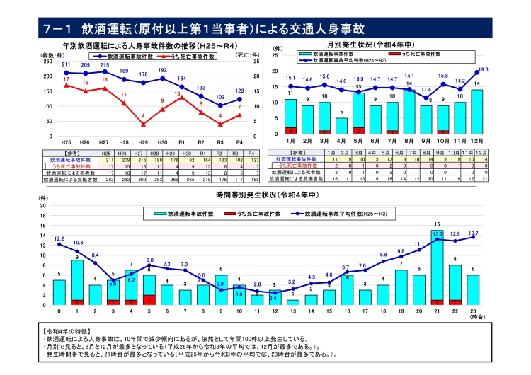 ・飲酒運転による交通人身事故は123件(前年比+21件)で、このうち死亡事故は7件(同+3件)と増加している。