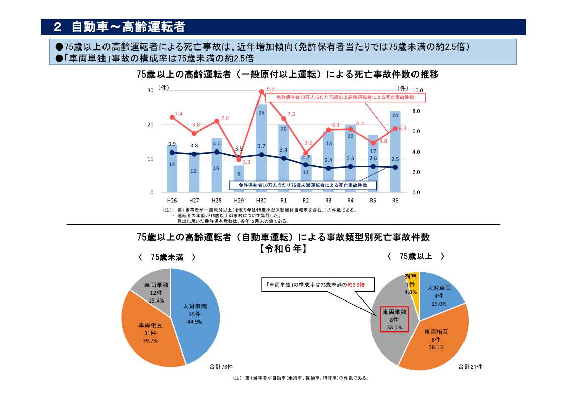 ・ 75歳以上の高齢運転者による死亡事故は、75歳未満の約2.5倍と増加傾向にある(資料2)。