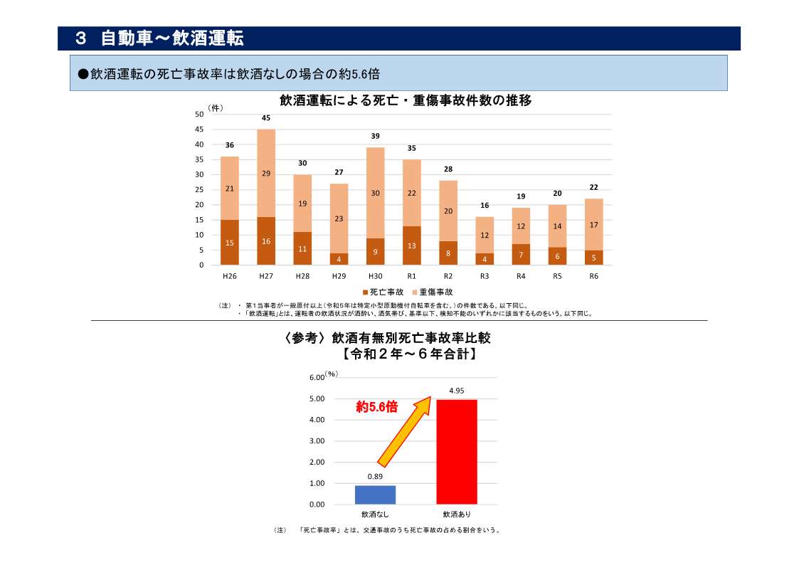 ・ 飲酒運転の死亡事故率は、飲酒なしの場合と比べ約5.6倍高くなっている(資料3)。