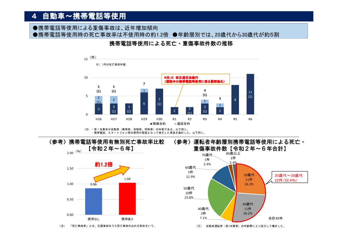 ・ 携帯電話等使用時の死亡事故率は不使用時の約1.2倍であり、年齢層別では20歳代から30歳代が全体の約5割を占めている(資料4)。