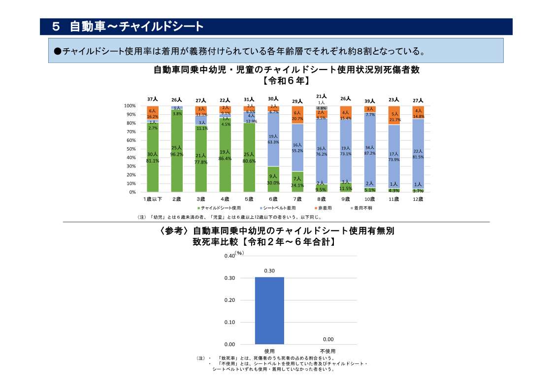・ チャイルドシート使用率は着用が義務付けられている各年齢層でそれぞれ約8割となっている(資料5)。