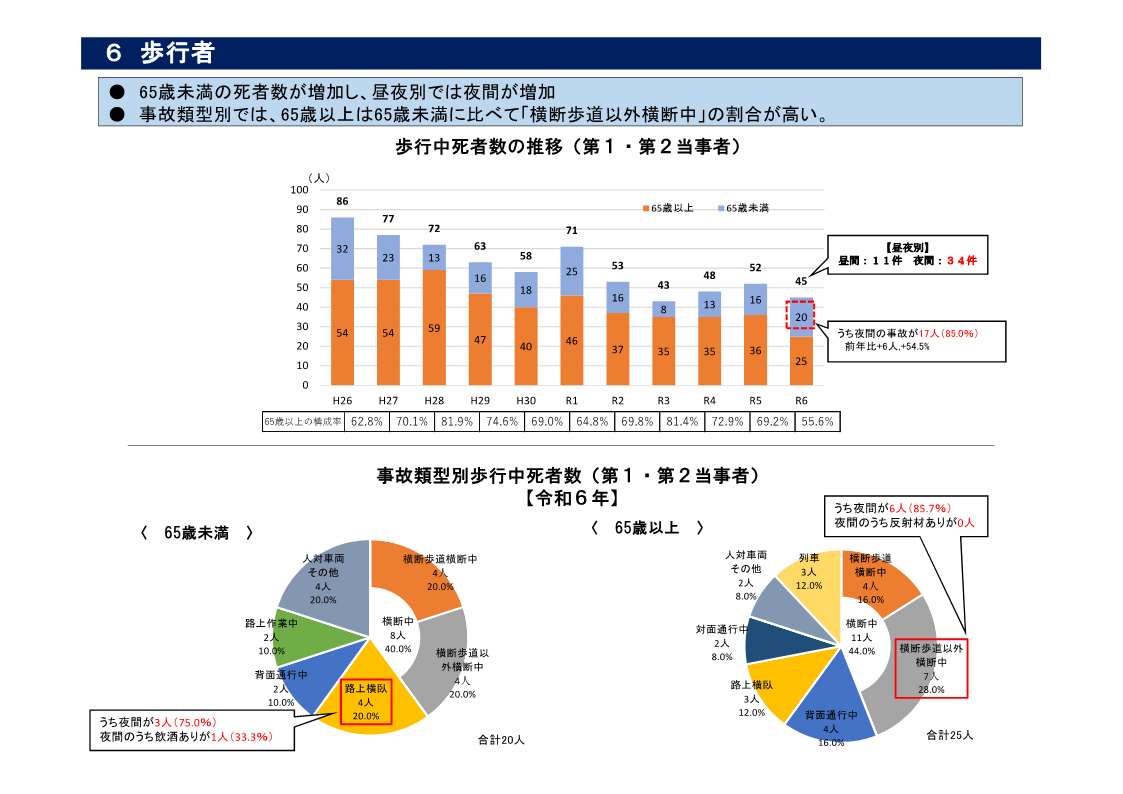 ・ 歩行中死者は65歳未満が増加し、昼夜別では夜間が増加している(資料6)。