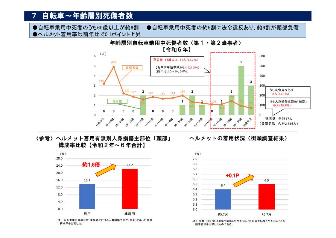・ 自転車乗用中死者のうち65歳以上が約6割を占めている(資料7)。