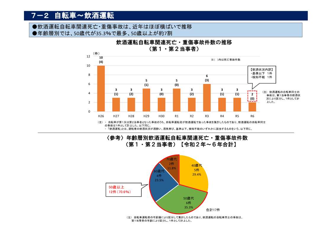 ・ 飲酒運転自転車関連死亡・重傷事故は、近年は横ばいで推移しており、年齢層別では50歳代が最多となっている(資料7-2)。