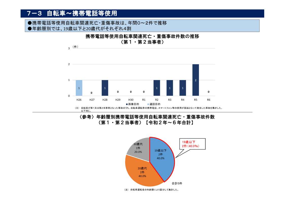 ・ 携帯電話等使用自転車関連死亡・重傷事故は年間0~2件で推移し、年齢層別では19歳以下と20歳代で全体の約8割を占めている(資料7-3)。
