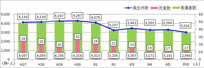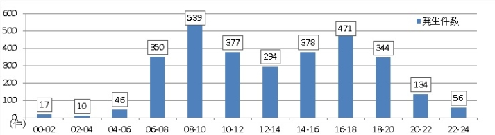 自転車事故の発生を年齢別に見ると、16歳と17歳が特に多く、また登下校時に多く発生しています。自転車に乗るときはヘルメットを着用し、交通ルールを守りましょう。