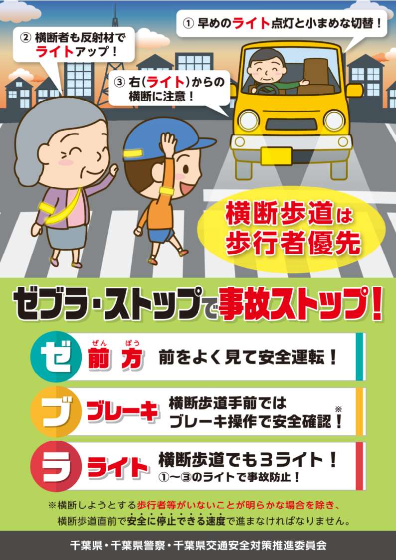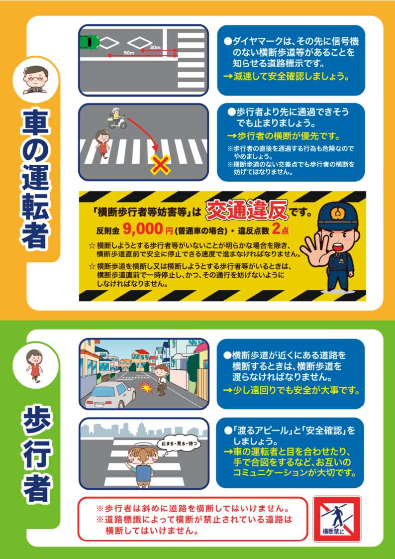運転者は「歩行者の安全を守ろう」歩行者は「正しい横断をしよう」