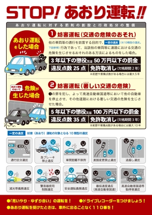 道路交通法の改正により、妨害運転に対する罰則が創設等されました。これにより、令和2年6月30日から、他の車両等の通行を妨害する目的で、急ブレーキ禁止違反や車間距離不保持等の違反行為(下記参照)を行うことは、交通指導取締りの対象となります。