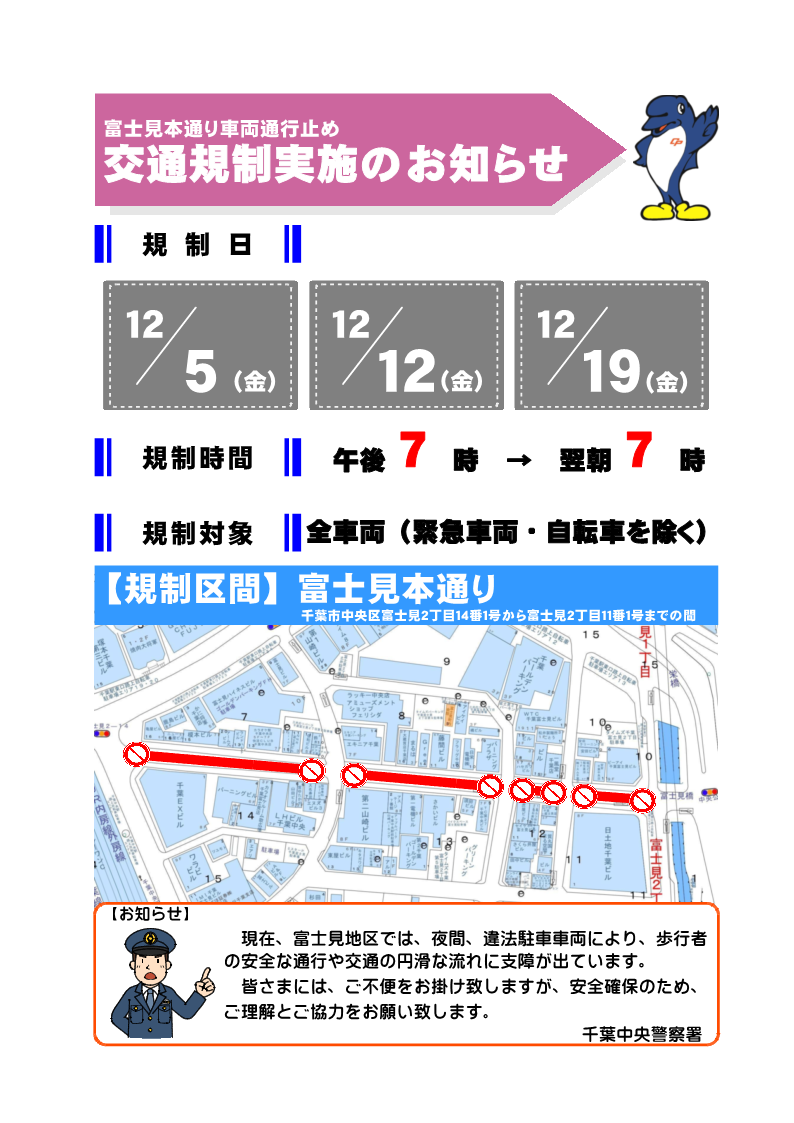 富士見本通り車両通行止め交通規制実施のお知らせ