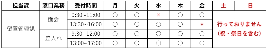 - 原則、留置管理課窓口で差し入れ者から直接受け付けるものとしています。