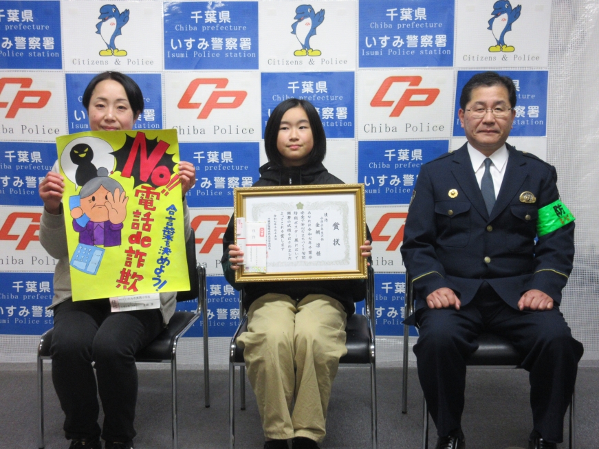 夷隅小学校6年の金綱凛さんが、令和7年千葉県安全で安心なまちづくり旬間防犯ポスター展において、小学6年生の部で佳作を受賞しました。電話de詐欺被害防止を訴える作品が評価され、いすみ警察署で表彰状伝達式を行いました。