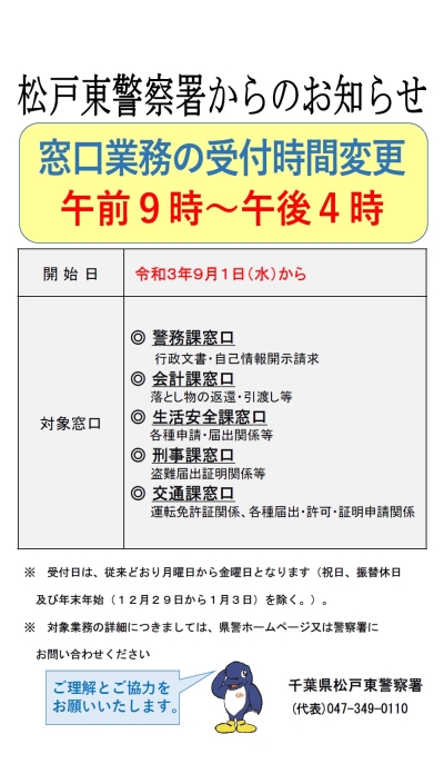 | 松戸東警察署 電話番号:047-349-0110 (代表) |