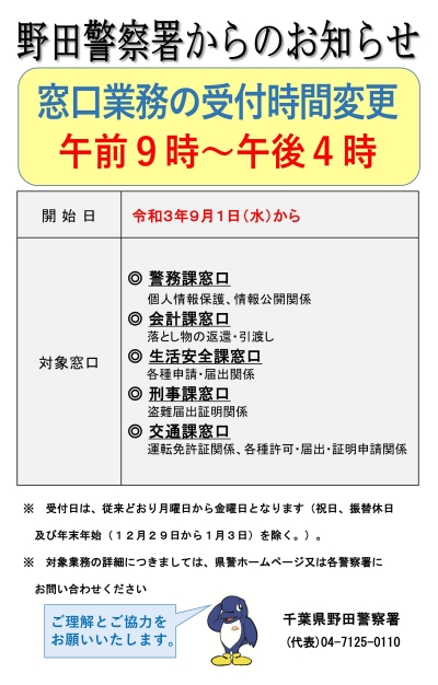 野田市駅前交番移設のお知らせ(PDF形式:408KB)野田警察署窓口業務の受付時間変更について