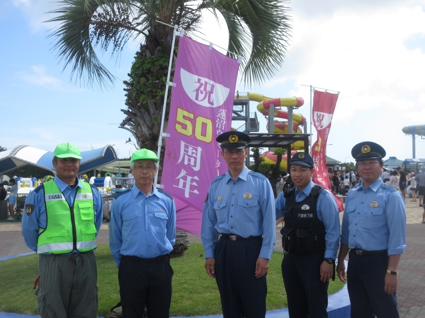 夏休み期間中の7月27日、8月3日と蓮沼ウォーターガーデンにおいて少年警察ボランティアの方々とパトロールを実施しました。この活動は、利用客の置き引きや痴漢、盗撮などの犯罪予防、及び少年の非行防止を目的としたものです。