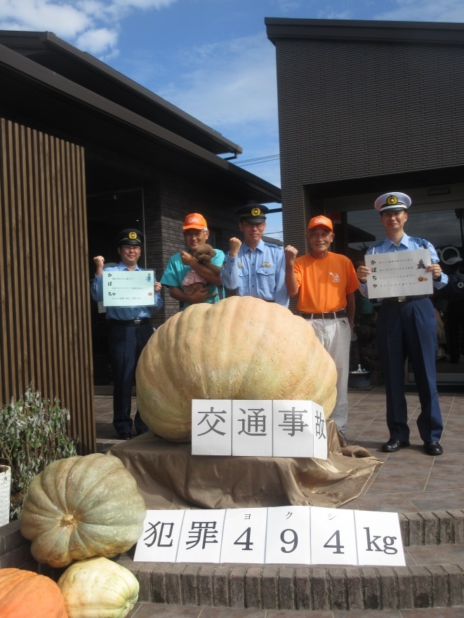 この地域の明るい話題を活かし、「カボチャ」の頭文字を使用した標語の作成、及び同カボチャの重量「494.2(よくし)キログラム」の語呂合わせで「犯罪抑止」及び「交通事故防止」の広報を実施しました!