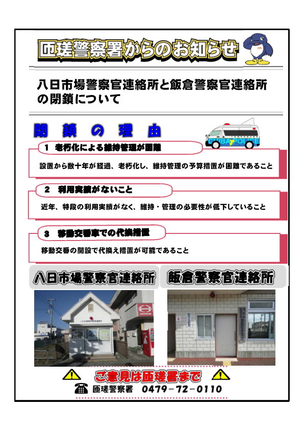 八日市場警察官連絡所と飯倉警察官連絡所の閉鎖について