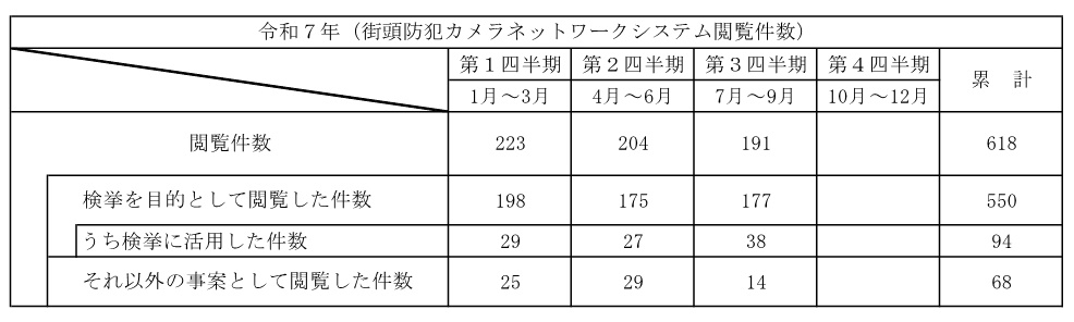 街頭防犯カメラネットワークシステムでは、令和7年(1月~9月まで)に618件の画像データを確認し、道路交通違反の検挙等に94件、行方不明者の捜査の事案等に68件それぞれ活用しました。