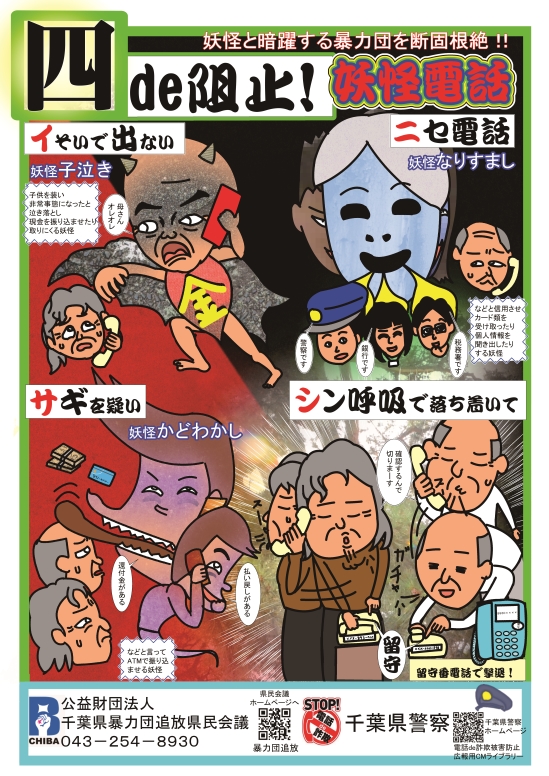 (※このポスターの作成にあたって、千葉県暴力団追放県民会議が詐欺犯人を各種妖怪と見立てるアイデア及び広報文全てを企画し、その監修の下に千葉県警察がデザインを担当したものです。)