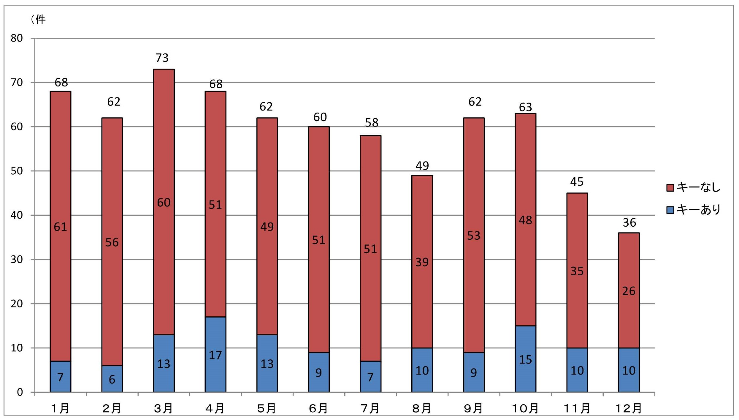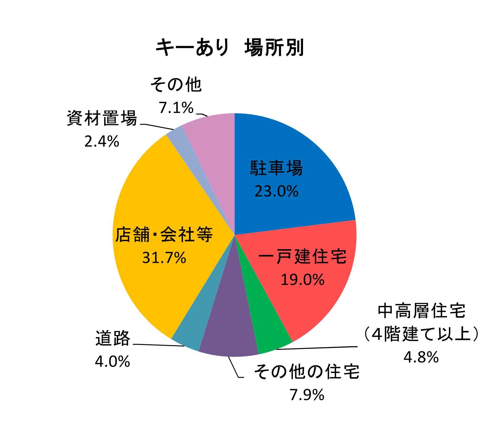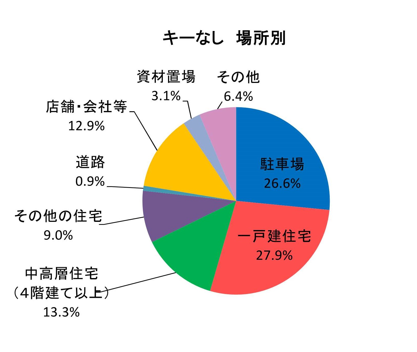 (2)キーを抜いた状態での盗難被害(キーなし)駐車場及び住宅敷地内での被害が全体の8割近くを占めています。完全施錠はもちろんのこと、ハンドルロックやタイヤロック等の盗難防止機器を活用しましょう。また、防犯カメラやチェーン式ゲートが設置されている等の防犯対策がしっかりした駐車場を選びましょう。