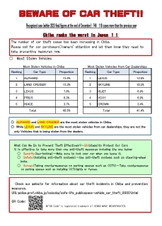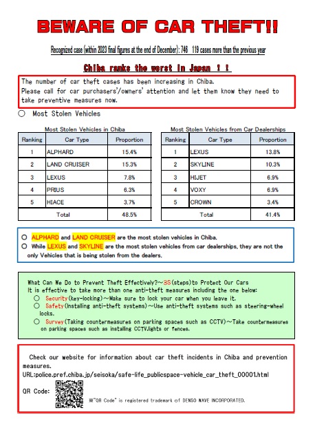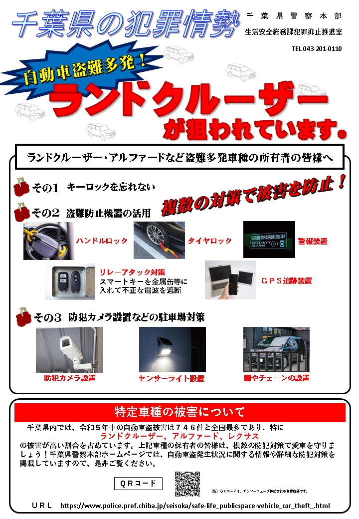 現在、千葉県では自動車盗難が多発しています。特にランドクルーザーやアルファードなどの特定車種が狙われています。盗難多発車種の保有者の皆様は、上記の防犯対策で車を守りましょう。自動車販売業の方など、盗難多発車種の保有者と接する機会がある皆様は、防犯対策の呼び掛けに下記チラシをご活用ください。外国の方向けに英語版もあわせてご活用ください。