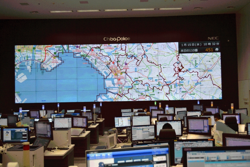 事件や事故などの緊急な通報(110番)にお応えする千葉県警察通信指令室です。 地図情報、カーロケータとPⅢ(ポリストリプルアイ)データ端末の位置情報及び画像の送受信など、最新の通信指令システムにより、素早い事件の解決を図ります。