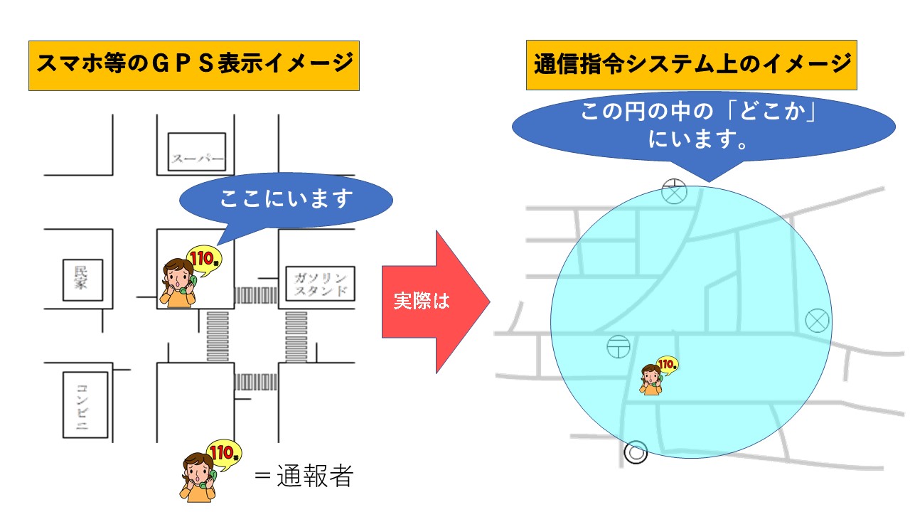 携帯電話及びスマートフォン等(以下「スマホ等」という。)の設定で、位置情報(GPS)の提供を許可している場合は110番通報をするだけで、通報した場所の特定が可能と思われる方がおられます。しかし、110番通報を受けた直後に通信指令室で取得される位置情報(GPS)は、スマホ等の電波を受信した範囲を円で表示しています。