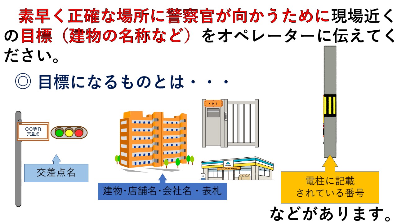 警察官が素早く正確な場所に向かうためには、周囲の建物等(住所地番や建物名、信号機に表示された交差点名)の名称や住所を確認していただき、オペレーターに伝えていただく必要があります。
