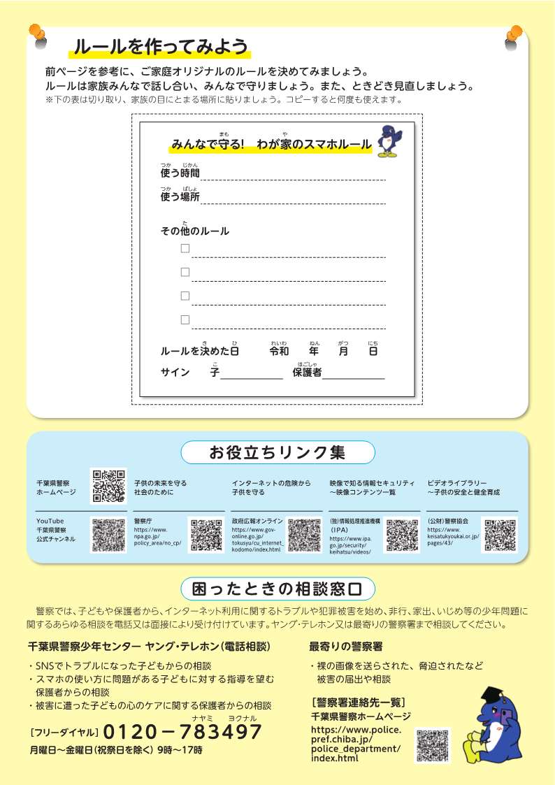 | 千葉県警察本部 少年課 電話番号:043-201-0110 (警察本部代表) |