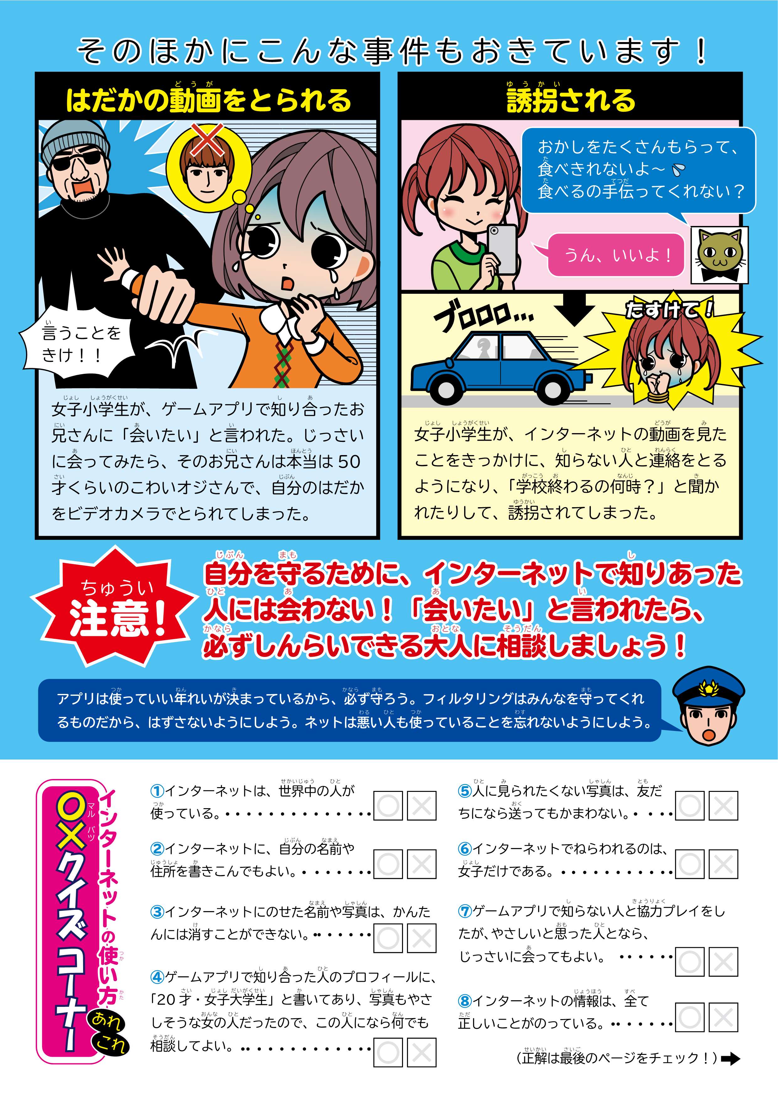 じっさいにあった事けんの話を読んだりクイズにちょう戦して、インターネットの正しい使い方について勉強しましょう。