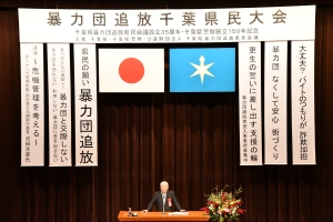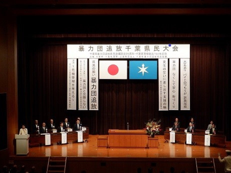 暴力団のいない安全と安心を実感できる暮らしを実現するため、千葉市内において暴力団追放県民大会が開催されました。この大会は官民一体となって連携・協力の下、さらなる暴力団排除意識の醸成を図ることを目的とし、県、県警及び県民会議の共催によるものです。この度は、県民会議の設立から35年、県警の創立から150年となることから、サブタイトルを「千葉県暴力団追放県民会議設立35周年・千葉県警察創立150年記念」としました。